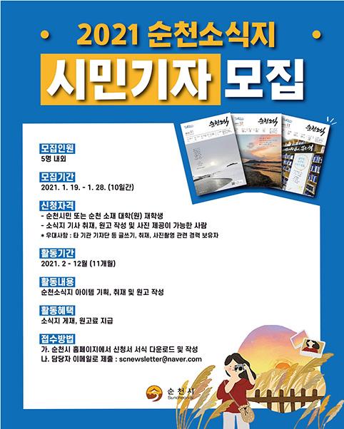 순천시가 매월 발행하는 시정소식지를 함께 만들어나갈 ‘순천소식지 시민기자’를 오는 28일까지 모집한다고 밝혔다.