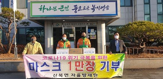 영암군 신북면 자율방재단(단장 조근배)에서는 최근 지속되고 있는 코로나19의 극복을 위해 지난 26일, 마스크 1만장을 기부하며 지역의 파수꾼 역할을 톡톡히 하고 있다.