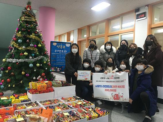 광주 선운초등학교 학생과 학부모들이, 지난달 28일 홀몸 어르신 등 돌봄 이웃의 훈훈한 설 명절을 위해 써달라며 십시일반으로 모은 라면 15박스와 나눔장터 운영 수익금 30만원을 어룡동 행정복지센터에 기부했다.