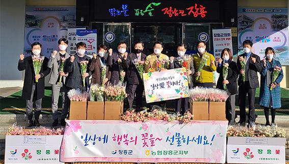 농협장흥군지부는 지난 16일 코로나19 장기화로 인해 각종 행사 취소 등으로 어려움을 겪고 있는 화훼농가 및 농업인을 위해 장흥군 화훼 소비 촉진 꽃 나눔 행사를 시행하였다.