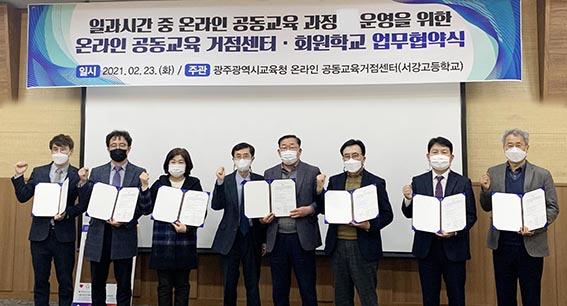 서강고가 지난 23일 광주김대중컨벤션센터에서 광주수피아여고, 동아여고, 빛고을고, 설월여고, 송원고, 조대여고 등 6개 학교와 일과시간 중 온라인 공동교육과정 운영을 위한 온라인 공동교육 거점센터·회원학교 업무협약을 체결했다고 24일 밝혔다.