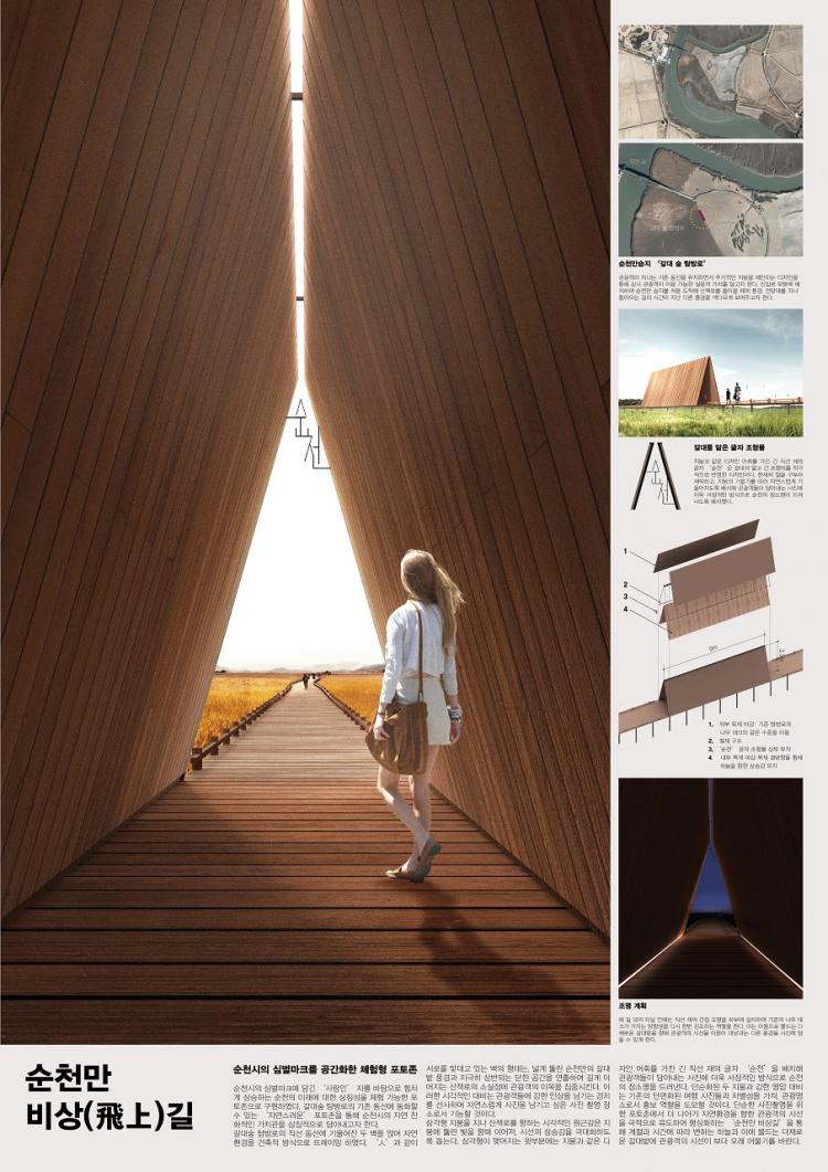 최우수상으로 선정된 ‘순천만 비상(飛上)길’은 순천시의 브랜드 슬로건 ‘人(in) suncheon’의 ‘사람 인(人)’자를 바탕으로 힘차게 상승하는 순천의 미래에 대한 상징성을 체험 가능한 포토존으로 구현하였다.