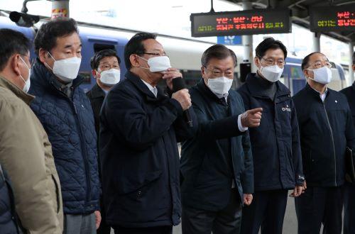 가장 먼저 광역 교통망 구축을 위한 핵심 인프라로 역할 할 부산 부전역을 찾았다. 송철호 울산광역시장으로부터 '동남권 광역교통망 구축 방안' 등을 보고 받았다.