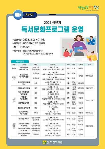 전남도립도서관이 코로나19 장기화로 지친 도민이 책 읽는 즐거움을 누리도록 2021년 상반기 독서문화프로그램을 비대면 강의로 운영한다.