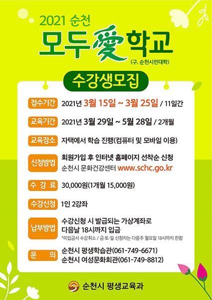 순천시는 2021년 1학기 모두愛학교 온라인 프로그램 교육에 참여할 수강생을 오는 15일부터 25일까지 11일간 모집한다고 밝혔다.
