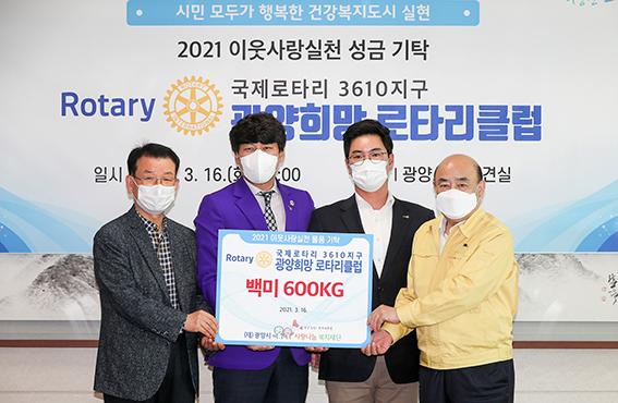 광양시는 국제로타리 3610지구 광양희망로타리클럽에서 지역 내 어려운 이웃을 위해 (재)광양시사랑나눔복지재단에 백미 600kg을 기탁했다고 17일 밝혔다.