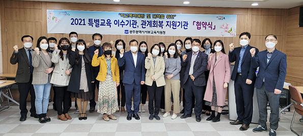 광주서부교육지원청이 18일 학교폭력 예방 및 대책을 위한 ‘2021 특별교육 이수기관, 관계회복 지원기관 협약식’을 개최했다.