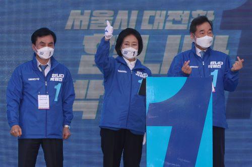 이날 오후 서울 구로구에서 출정식을 가진 박영선 더불어민주당 후보는 이낙연 상임선거대책위원장과 경선 상대였던 우상호 민주당 의원, 조정훈 시대전환 의원을 비롯해 서영교·안규백 등 서울지역 의원들의 지원을 받으며 지지를 호소했다.