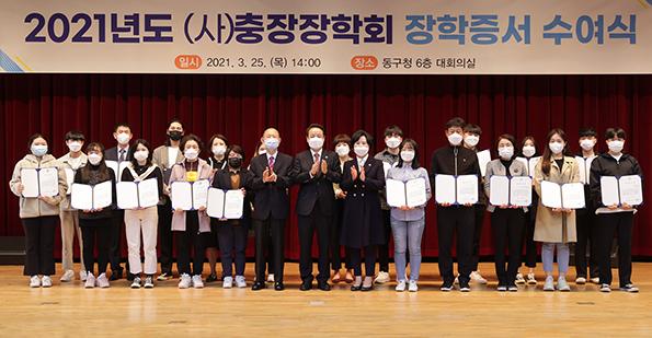 충장장학회는 25일 동구청 6층 대회의실에서 2021년 장학증서 수여식을 개최했다. 이날 김백규 이사장의 사재 출연으로 관내 대학생 40명에게 개별증서 전달과 함께 1인당 2백만 원씩 총 8천만 원이 전달됐다.