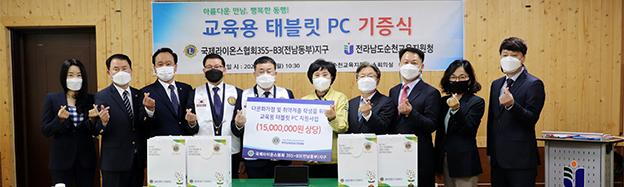 방동현 국제라이온스 전남동부지구 총재는 “코로나19 상황으로 학년별로 원격수업이 진행되는 학교도 있는데 가정 형편이 어려워 컴퓨터가 없거나 사양이 낮은 컴퓨터로 원격수업에 임하는 학생들에게 도움을 주고자 순천교육지원청에 15대의 태블릿 PC를 지원하게 되어 기쁘다”면서 “25대의 태블릿 PC를 동부지역 교육지원청에도 각각 전달할 계획”이라고 밝혔다.