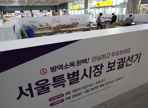 4.7 재·보궐선거 사전투표를 이틀 앞둔 지난달 31일 오후 서울 용산역 KTX 승강장 앞에서 선거관리위원회 관계자들이 사전투표소를 설치하고 있다.