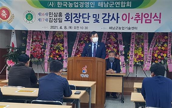 (사)한국농업경영인해남군연합회 제16·17대 회장단 이취임식이 지난 8일 해남군농업기술센터에서 열렸다.