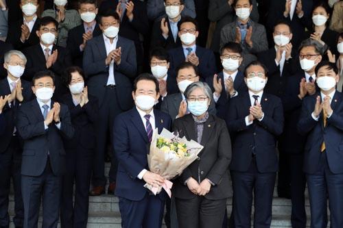 정세균 국무총리가 16일 오후 종로구 정부서울청사에서 열린 환송식 이임식을 마친 뒤 현관 앞에서 정은경 질병관리청장에게 꽃다발을 받고 있다.