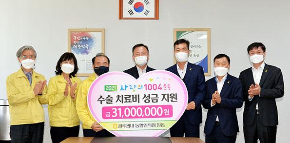 농협중앙회 광주지역본부는 ‘사랑의 1004운동’을 통해 중증질환 등으로 어려움을 겪는 와중 학교생활에 성실히 임하고 있는 학생 19명(초 10명, 중 4명, 고 5명)에게 각각 100만 원씩 치료비로 지원할 예정이다.