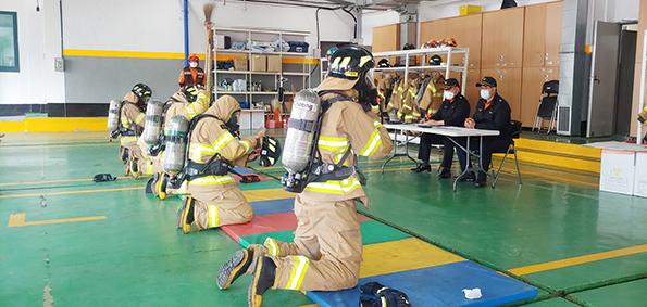 평가 항목은 ▲재난현장표준작전절차 숙지도 ▲공기호습기 장착 및 비상호흡법 ▲로프매듭법 ▲팀전술(2인조) 화재진압 등이다. 직원들은 코로나19 확산 방지를 위해 일정 간격 거리두기, 손 소독 등 감염병 예방수칙을 철저히 준수하면서 진지한 모습으로 훈련 평가에 임했다.