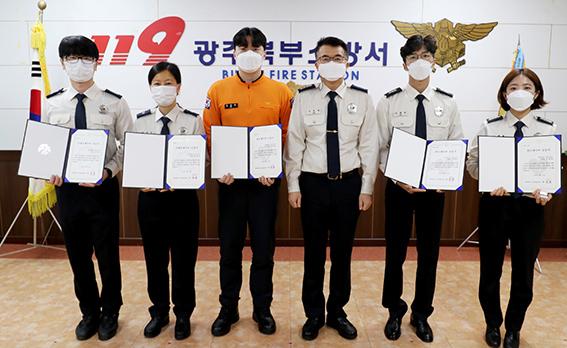 광주북부소방서는 3일 위급한 시민에게 적절한 전문 응급처치 시행과 이송병원 선정으로 환자 회복에 크게 기여한 119구급대원 총 7명에게 '하트·브레인 세이버' 인증서와 배지를 수여했다.