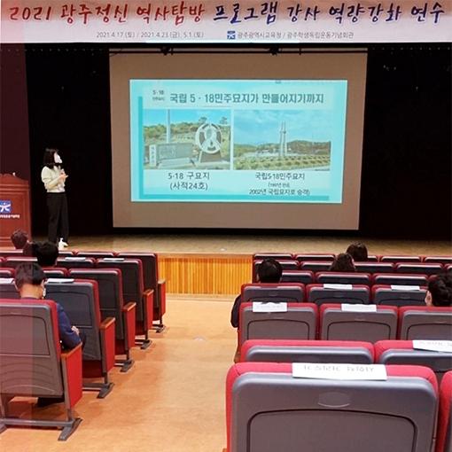 올해는 시교육청의 ‘2021학년도 현장체험학습 운영 가이드라인’에 맞춰 현장탐방 운영이 불가능할 경우를 대비해 ‘학교로 찾아가는 광주정신 역사탐방 프로그램’을 준비했다. 광주학생독립운동기념회관은 현직·퇴직교원 및 역사문화관광해설사 등 역사분야의 역량 있는 강사를 모집해 지난 4월17일~5월1일 강사 역량강화 연수를 마쳤다. 해당 프로그램은 ▲광주정신이란 무엇일까요? ▲광주정신이 깃든 광주시내 유적지나 기념관은 어디에 있을까요? ▲광주정신, 어떻게 계승할까요? 등으로 구성됐다.