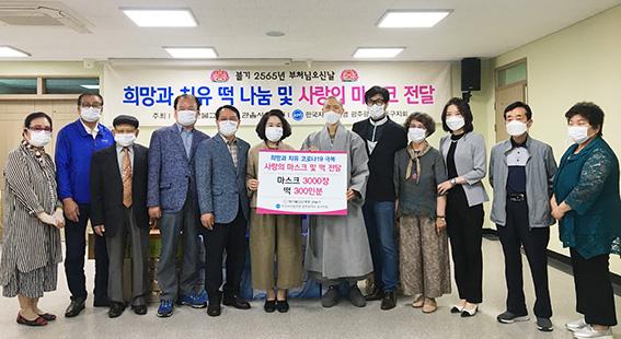 이날 자유총연맹 광주광역시 동구지회도 미얀마를 응원하는 세 손가락 마크 및 문구를 새겨 넣은 마스크 3천 장을 제작해 경로당 어르신들게 전달해 달라며 충장동 주민센터에 전달했다.