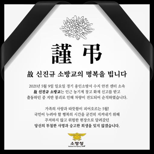 한편 경기 용인소방서 소속 故 신진규 소방교는 지난 9일 성남의 한 농기계 창고에서 발생한 화재를 진압하기 위해 출동하던 중 지반 붕괴로 인해 차량이 전도되어 순직했다.