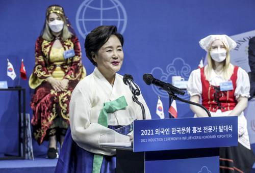 김 여사는 이날 오후 서울 동대문구 서울콘텐츠문화광장에서 열린 '2021 외국인 한국문화 홍보 전문가 발대식'에서 축사를 통해 이같이 밝혔다.
