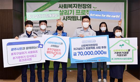 기아 오토랜드 광주는 20일 광주사업장 의전관에서 박치용 경영지원실장이 '기아위드 지구 살리기 프로젝트' 진행을 위해 박향 광주시 복지건강국장과 김천수 광주사회복지협의회장에게 후원금 7000만원을 전달했다고 밝혔다.