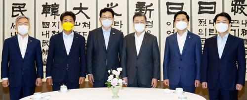 문재인 대통령이 26일 청와대에서 열린 여야 정당 대표 대화에 앞서 기념촬영을 하고 있다. 왼쪽부터 최강욱 열린민주당 대표, 여영국 정의당 대표, 송영길 더불어민주당 대표, 문재인 대통령, 김기현 국민의힘 대표 권한대행, 안철수 국민의당 대표.