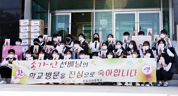 진도중·지산중학교 등을 최근 방문한 송가인씨는 2집 앨범과 자서전, 손소독제 등 약 1000여 만원 상당의 물품을 후배들에게 전달하고 꿈을 향한 대화의 시간도 가졌다.
