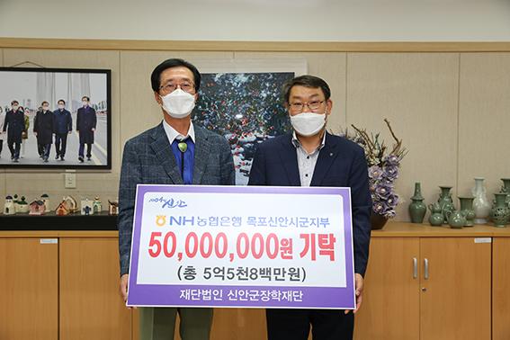 NH농협은행 목포신안시군지부 고영인 지부장과 임원들은 2일 신안군청을 방문해 지역인재육성을 위해 사용해 달라며 5천만원의 장학기금을 전달했다.