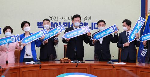 송영길 더불어민주당 대표, 윤호중 원내대표 등 당 지도부가 7일 서울 여의도 국회에서 열린 최고위원회의에 앞서 백신 접종을 위한 '더불어백신 챌린지 SNS캠페인'을 하고 있다.