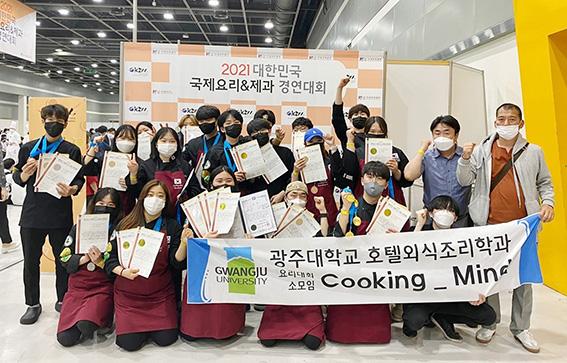 광주대 호텔외식조리학과 조리대회팀 쿠킹마인드는 최근 서울 양재동 AT센터에서 열린 '2021 대한민국 국제요리&제과 경연대회'에서 대상과 최우수상, 금상 4개, 은상 4개, 동상 4개를 수상했다고 9일 밝혔다.