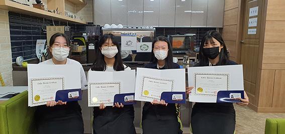 28일 서진여고에 따르면 학생들의 자격증 취득은 자율동아리 활성화 프로그램의 성과라 할 수 있다. 서진여고는 학생들이 ‘가고 싶은 학교’ 조성을 위해 광주시교육청에서 지원하는 특성화고 혁신지원보조금 사업을 통해 자율동아리 활성화 프로그램 등을 추진하고 있다. 관심 있는 분야의 자율동아리를 개설할 수 있도록 학생들을 적극 지원했고, 전문지식을 쌓을 수 있도록 외부 강습 및 특강도 제공했다. 자율동아리 활성화 노력이 ‘브런치·카페 CEO Start-Up동아리’ 소속 2학년 박선경·김서경·최다인·정인경 학생 4명의 커피 바리스타 2급 자격증 취득에 큰 도움이 됐다.