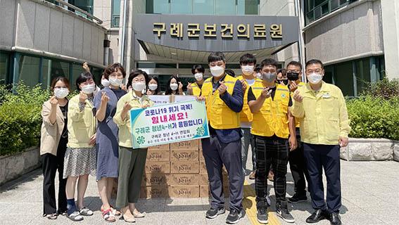 구례군 청년4-H회는 지난 1일 구례군 보건의료원을 방문해 50만원 상당의 간식과 청년4-H회 김상수 회원이 생산한 초당옥수수 50박스를 응원의 메시지와 함께 전달했다.