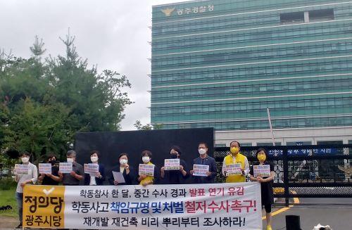 정의당 광주시당은 8일 오전 광주 광산구 광주경찰청 앞에서 기자회견을 열고 "직접적 사고 원인 규명 이상으로 중요한 것은 현대산업개발 책임, 학동 4구역 재개발 조합 비리 문제다"며 이 같이 밝혔다.