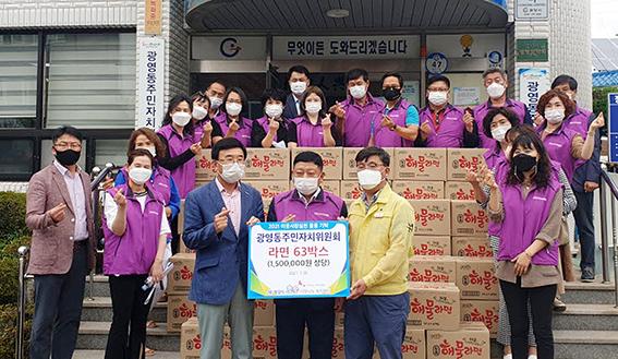 광양시 광영동 주민자치위원회는 지난 20일 어려운 이웃을 위해 150만 원 상당의 라면 63박스를 광영동주민센터에 기부했다.