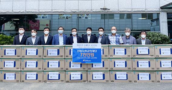 신협중앙회 광주전남지역본부는 5일 강진신협 본점에서 이문규 광주전남지역본부장, 김용식 신협전남지역협의회장 등이 참석한 가운데 집중호우 피해 지원을 위한 구호성금과 생필품을 전달했다고 밝혔다. (사진=신협 제공). 2021.08.05.