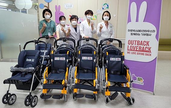 아웃백은 지난 1월 어린이 환자를 위해 써달라며 1500만원을 기부했으며, 이 후원금으로 어린이환자용 휠체어(3대)·유모차(8대) 그리고 환아복(600벌)을 구입했다.