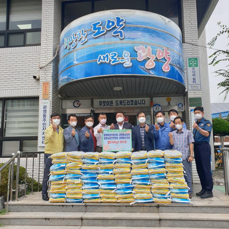 광양시 광영동 4개 사회단체에서 지난 1일 광영동 주민센터에 쌀 80포를 기탁하며 코로나19 극복을 위한 지역사회 온정의 릴레이가 이어져 훈훈함을 더하고 있다.