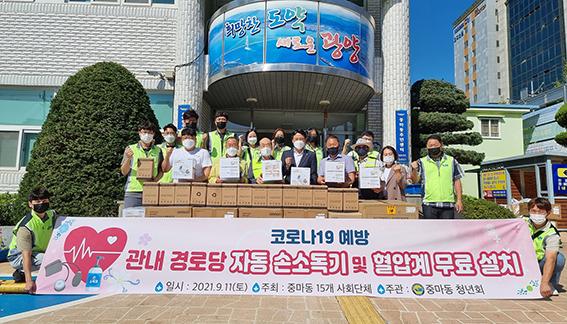 광양시 중마동 15개 사회단체는 중마동청년회 주관으로 지역 내 경로당 29개소에 자동 손소독기와 혈압계를 무료로 설치하는 사업을 실시했다.