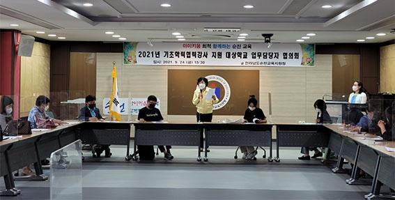 순천교육지원청은 코로나19로 급속히 증가한 학습격차를 해소해 보고자 초등학교 14교, 중학교 3교에 2학기 기초학력 협력강사를 지원한 학교 교감과 업무 담당 교사 34명을 대상으로 기초학력 협력강사 업무 담당자 협의회를 갖고 학습격차 해소를 위해 발벗고 나섰다.