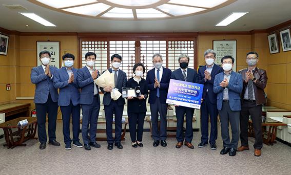 고 노성만 전 전남대총장 가족들이 전남대를 방문, 학교발전기금 4800만 원을 전달한 뒤 기념사진을 찍는 모습. (사진 제공=전남대학교)