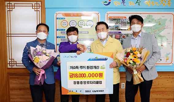 장흥군은 7일 장흥중앙로타리클럽에서 저소득가정 주거환경 개선을 위한 후원금 1800만 원을 기탁했다고 밝혔다.