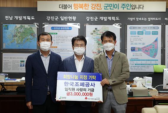 한국조폐공사가 강진군 청소년 가장들과 저소득층 아동을 위해 300만 원의 후원금을 기부했다.