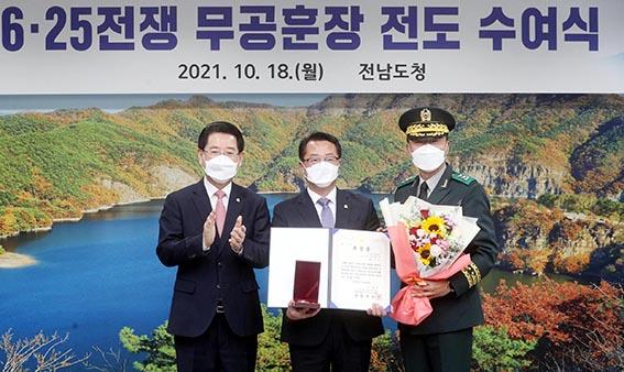 문금주 전남도 행정부지사가 6·25 전쟁 당시 조국을 수호한 아버지 고(故) 문태환 하사를 대신해 18일 전남도청에서 6·25 전쟁 무공훈장을 전달 받았다.