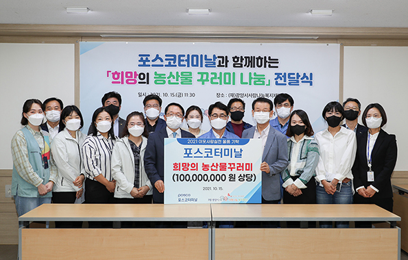 포스코터미날은 이웃사랑 실천의 일환으로 1억 원 상당의 ‘희망의 농산물꾸러미’를 (재)광양시사랑나눔복지재단에 기탁했다.