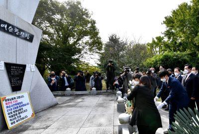 이준석 국민의힘 대표와 의원·당직자가 21일 오전 전남 순천시 순천 팔마종합운동장 내 여순항쟁탑을 찾아 참배하고 있다.