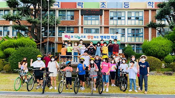 26일 광주극락초에 따르면 ‘자전거 타기’는 환경교육과 안전교육의 일환으로 계획된 계절학교 프로그램이다. 교내에서 ‘자전거 함께 타기 교육’ 실시 후 학년별 도전 거리를 다르게 해 4학년은 영산강 자전거길 안내센터, 5학년은 영산강 자전거길, 6학년은 승촌보 코스를 완주하면 ‘자전거 타기’ 프로그램은 마무리된다. 학생 성장 및 안전을 고려해 3학년의 경우 교내에 마련된 코스를 완주하면 된다. 학부모들은 학생들이 주행을 잘 마무리 할 수 있도록 지원하는 역할을 하고 있다.