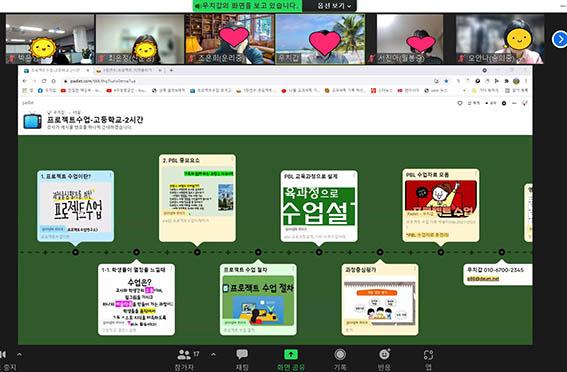 실시간 쌍방향 방식으로 진행된 이번 연수는 학생들과 상호작용할 수 있는 다양한 교육용 소프트웨어와 어플 등을 활용해 진행됐다. 교사들은 학생 입장이 돼 소외받는 학생 없이 모두가 수업에 참여하는 방법과 학생들의 발표의 질을 높이는 방법을 공유했다. 또 ‘프로젝트 수업’ 책을 미리 읽고 저자의 강의를 들으면서 프로젝트 수업의 핵심 요소와 수업 사례를 살펴보는 활동형 연수로 진행돼 참여자들의 좋은 반응을 얻었다.