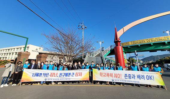 광양여고 정문에서 실시한 캠페인은 학교폭력 예방 홍보 물품, 마스크, 간식 꾸러미 배부와 ‘나에겐 작은 장난, 친구에겐 큰 상처’, ‘학교폭력 NO! 존중과 배려 OK!’라는 문구의 플래카드를 활용해 진행됐다.