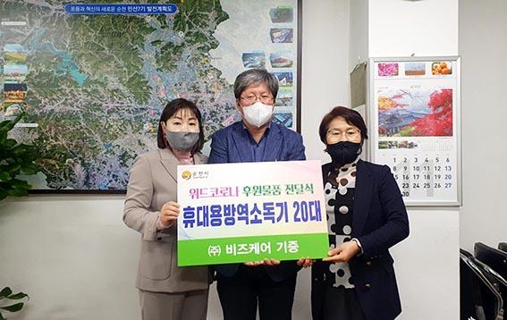 ㈜비즈케어는 위드코로나 시대에 대비해 자사가 자체 개발해 판매중인 휴대용 전동방역소독기 20대와 소독액을 지난 5일 순천시에 전달했다.