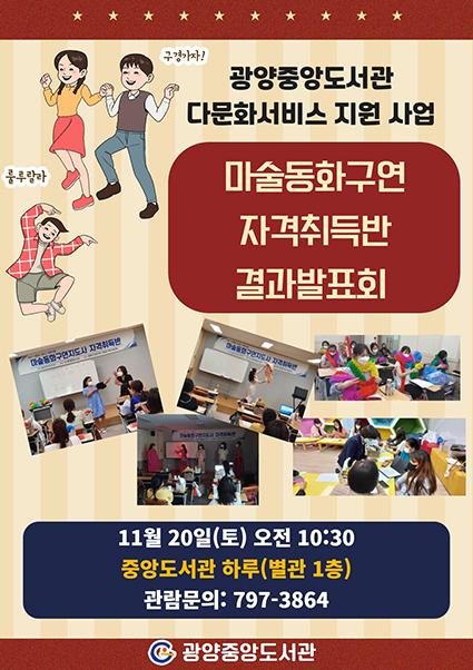 ‘마술동화구연지도사 자격취득반’ 프로그램은 지난 문화체육관광부에서 주관하는 국비 지원사업 ‘2021 도서관 다문화 서비스 지원사업’의 일환으로, 지난 7~11월 총 12회 운영했다.